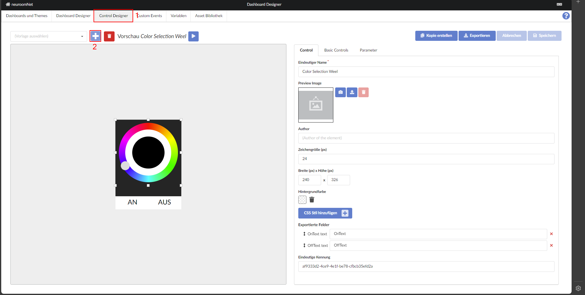 Um eine neue Vorlage zu erstellen, wechseln Sie auf die Registerkarte „Control Designer“ und klicken Sie auf das Pluszeichen oben links auf der Seite.