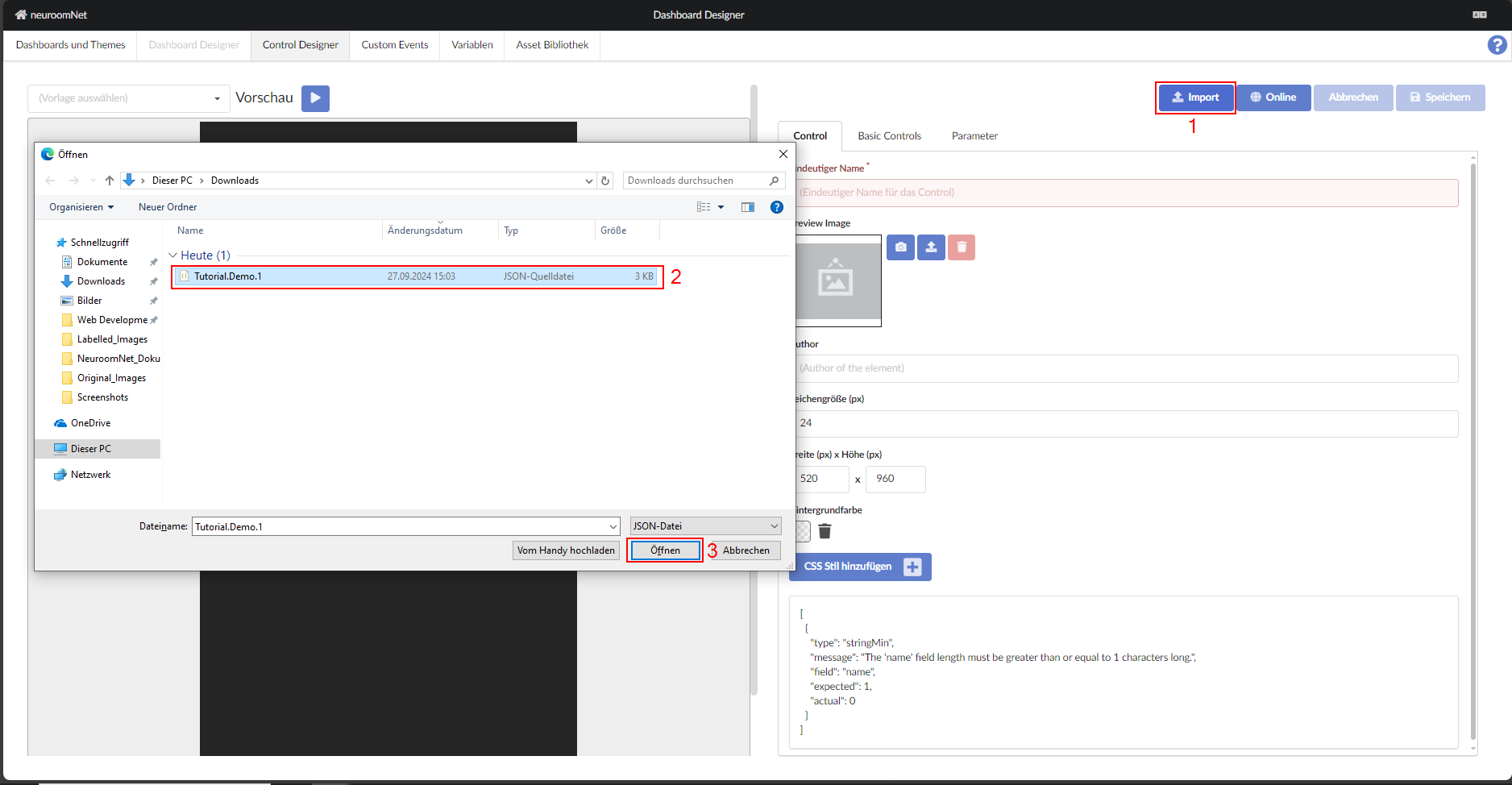 Wird eine Vorlage neu erstellt, so ist es auch möglich eine entsprechende JSON Datei über die angebotene Schaltfläche zu importieren.