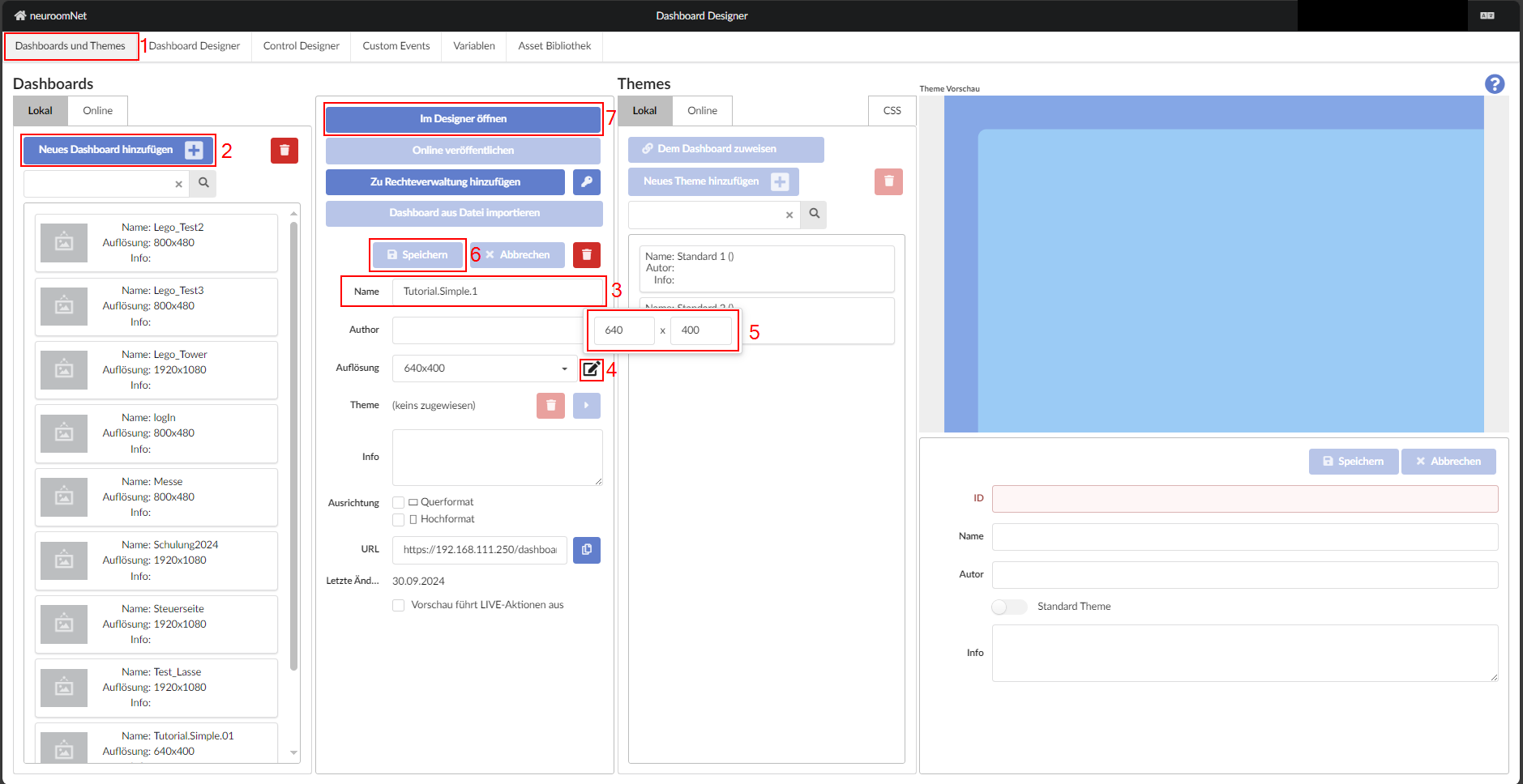 Um ein neues Dashboard hinzuzufügen, navigiere zuerst in der Navigationsleiste zu "Dashboard und Themes" aus. Oben links findet man die Option "Neues Dashboard hinzufügen", die man auswählt, dann kann die im Bild dargestellten Schritte gefolgt werden.