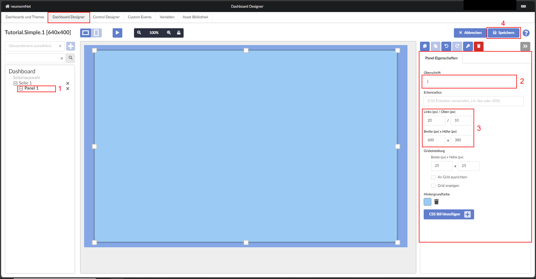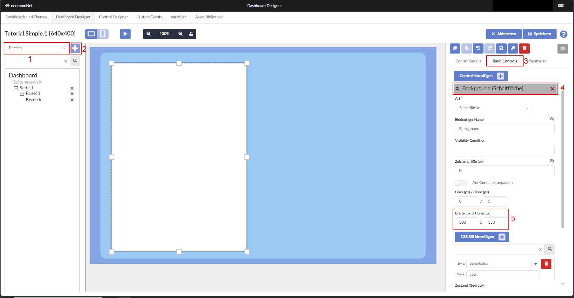 Um einen neuen „Bereich“ zu erstellen, wird auf der Registerkarte „Dashboard-Designer“ automatisch ein neues Panel erstellt, dessen Abmessungen sich von den Abmessungen unterscheiden, die auf der Registerkarte „Dashboard und Themen“ festgelegt wurden (640 x 400). Um die Größe des Bereichs so zu ändern, dass er horizontal und vertikal mittig auf der Seite ausgerichtet ist, müssen die Abmessungen wie unten gezeigt angepasst werden: