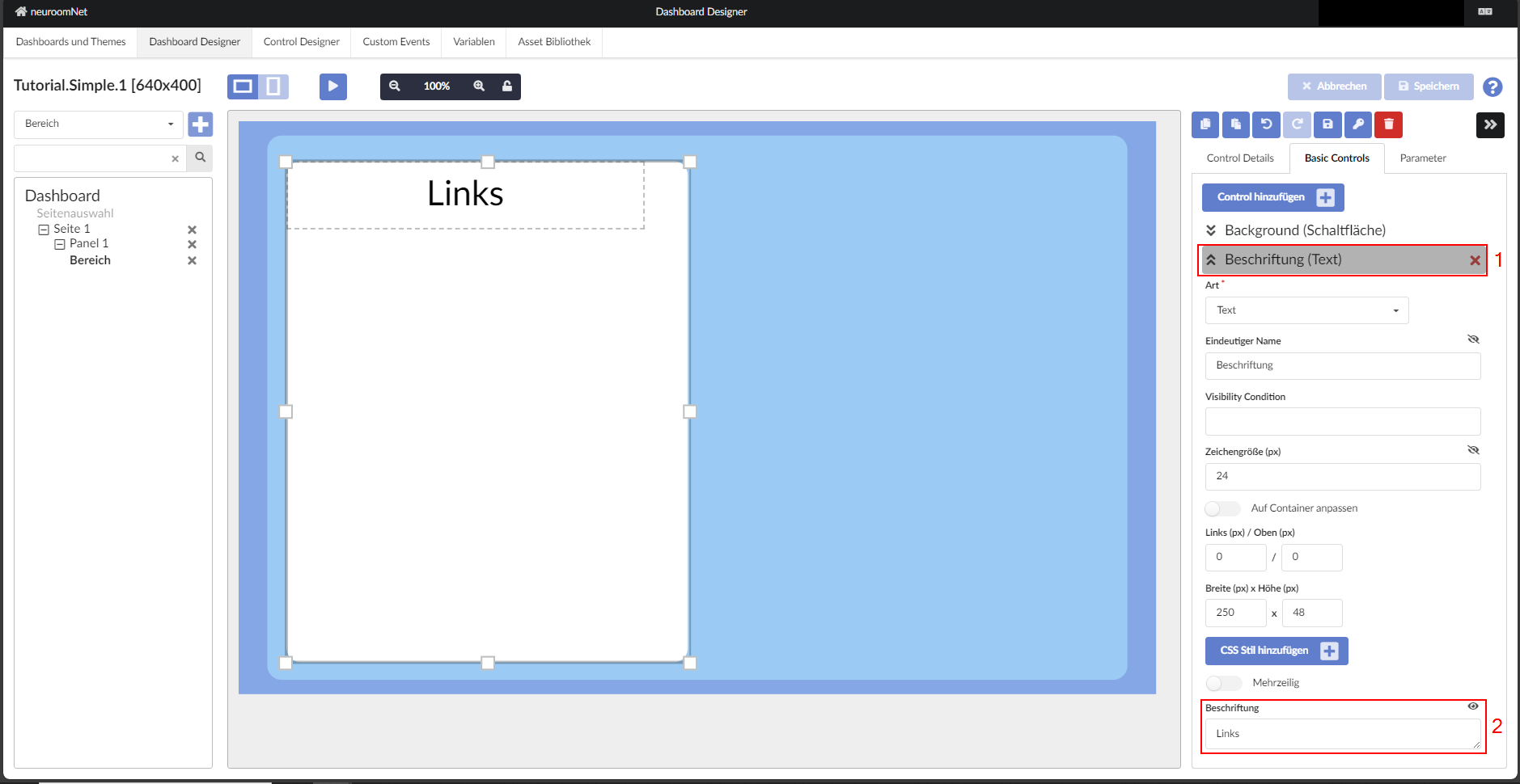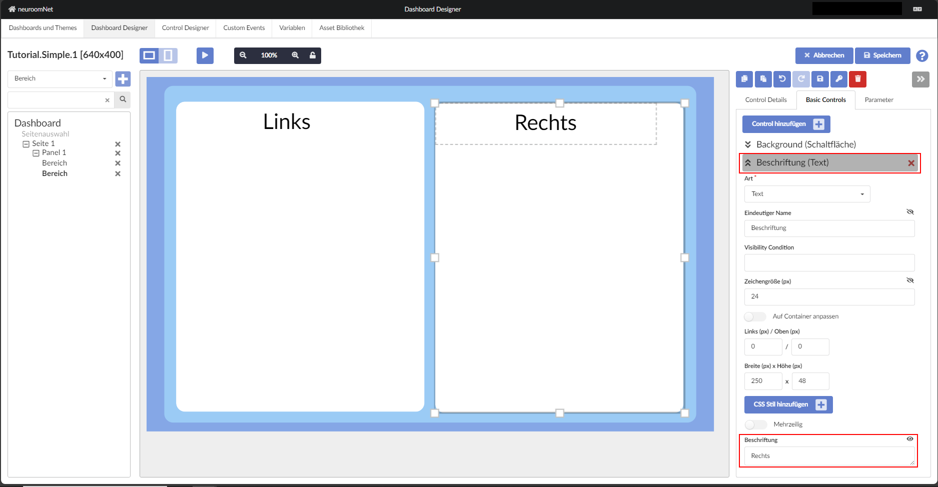 Auf der Steuerseite wird nun ein neuer Bereich angelegt und positioniert. Oft erweist es sich als hilfreich, Position und Dimension mit der Maus grob festzulegen und dann die Konfiguration direkt über die Eigenschaften anzupassen. In späteren NeuroomNet-Versionen wird es evtl. gesonderte Werkzeuge zur Anordnung geben aber im Beispiel ist gezeigt, wie man aktuell (Stand NeuroomNet 2023.3) die beiden Bereiche oben und unten (über die Höhe) einfach ausrichteten kann.