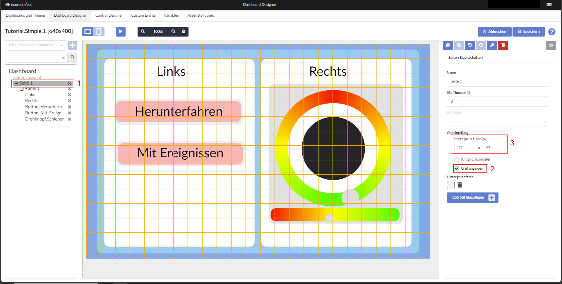 Tipp: Um die Objekte im Verhältnis zueinander genauer auszurichten, kann das Grid verwendet werden. Um das Grid einzublenden, klickt man auf das Wurzelelement - die Seite „Seite 1“ - und setzt man unter dem Reiter „Seiteneigenschaften“ ein Häkchen bei „Raster anzeigen“. Nun kann die Größe des Grids angepasst werden, um die Linien des Grids an den Elementen auszurichten.